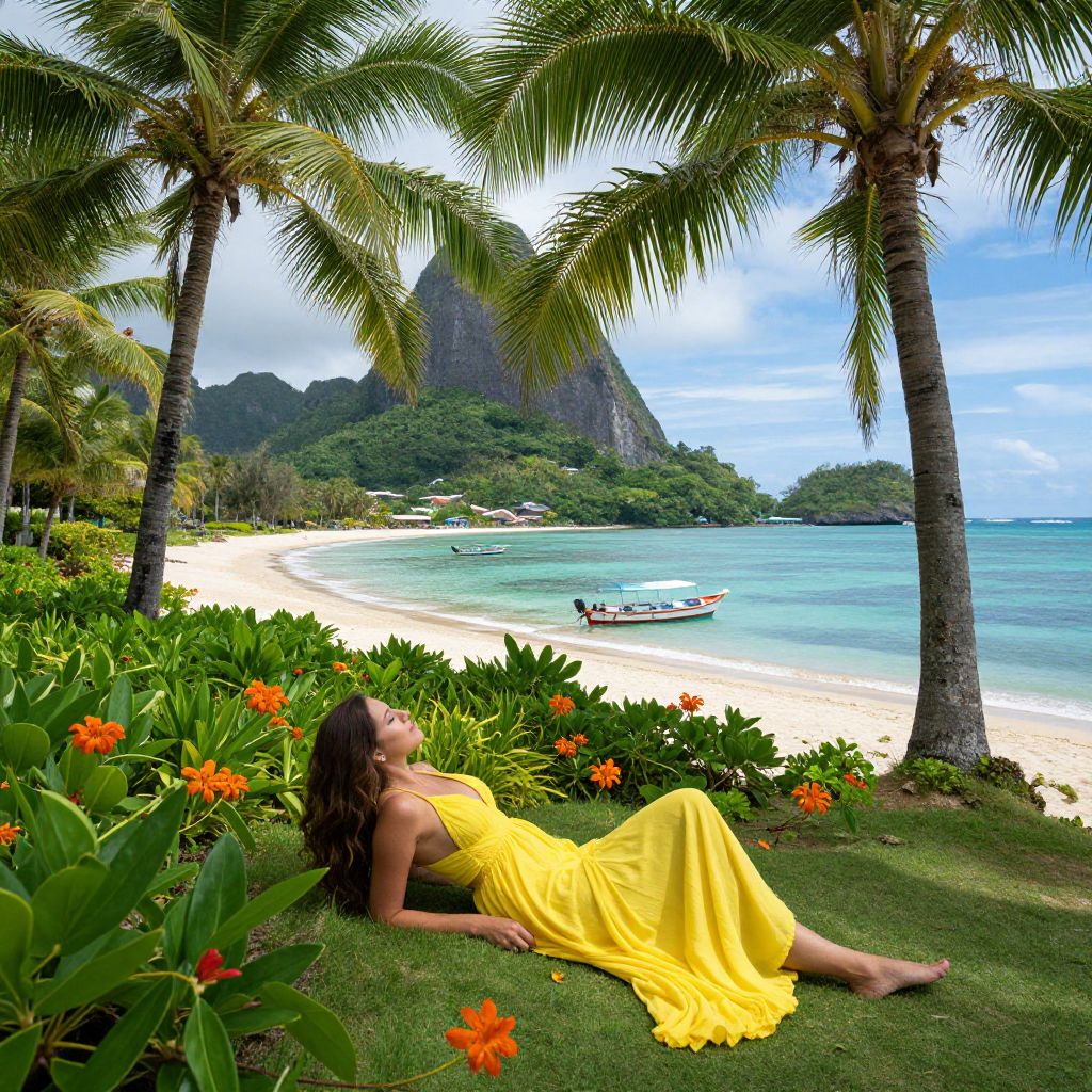 Tropical paradise unfolds as a woman in a vibrant yellow dress reclines amidst lush greenery and orange flowers, framed by towering palm trees and a serene beach where small boats drift near a picturesque coastal village under a mountainous backdrop.