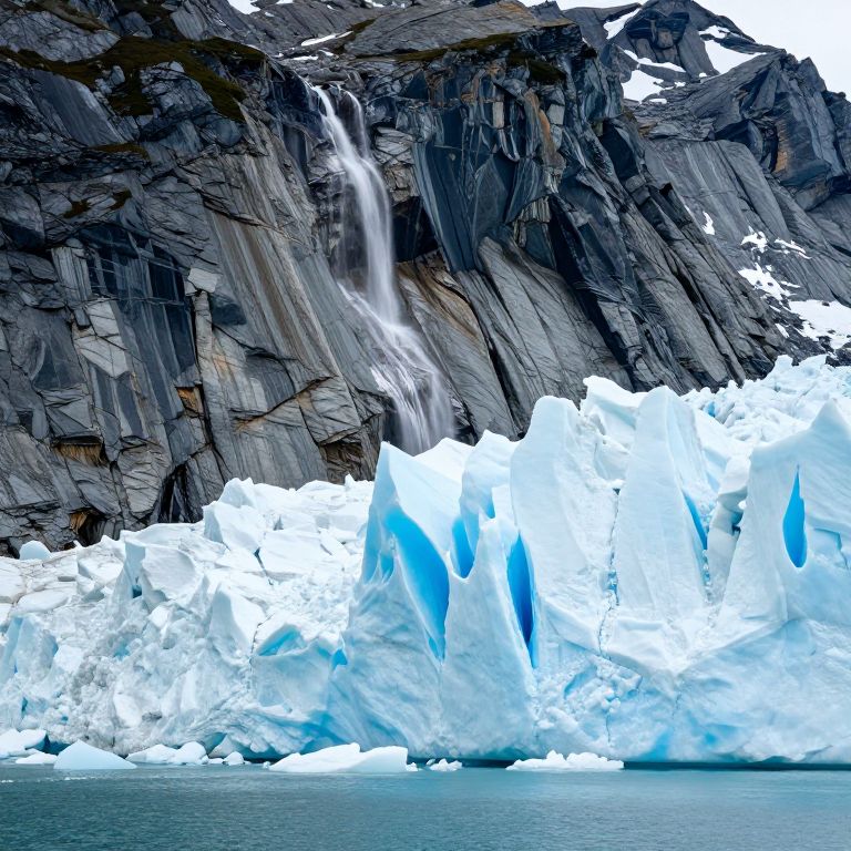Massive blue ice formations cascade dramatically down steep rocky cliffs, creating a serene yet powerful scene where jagged glaciers meet calm turquoise waters below.