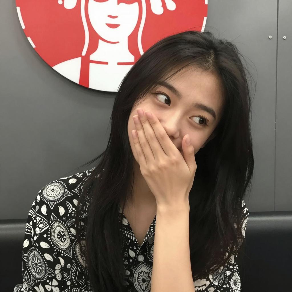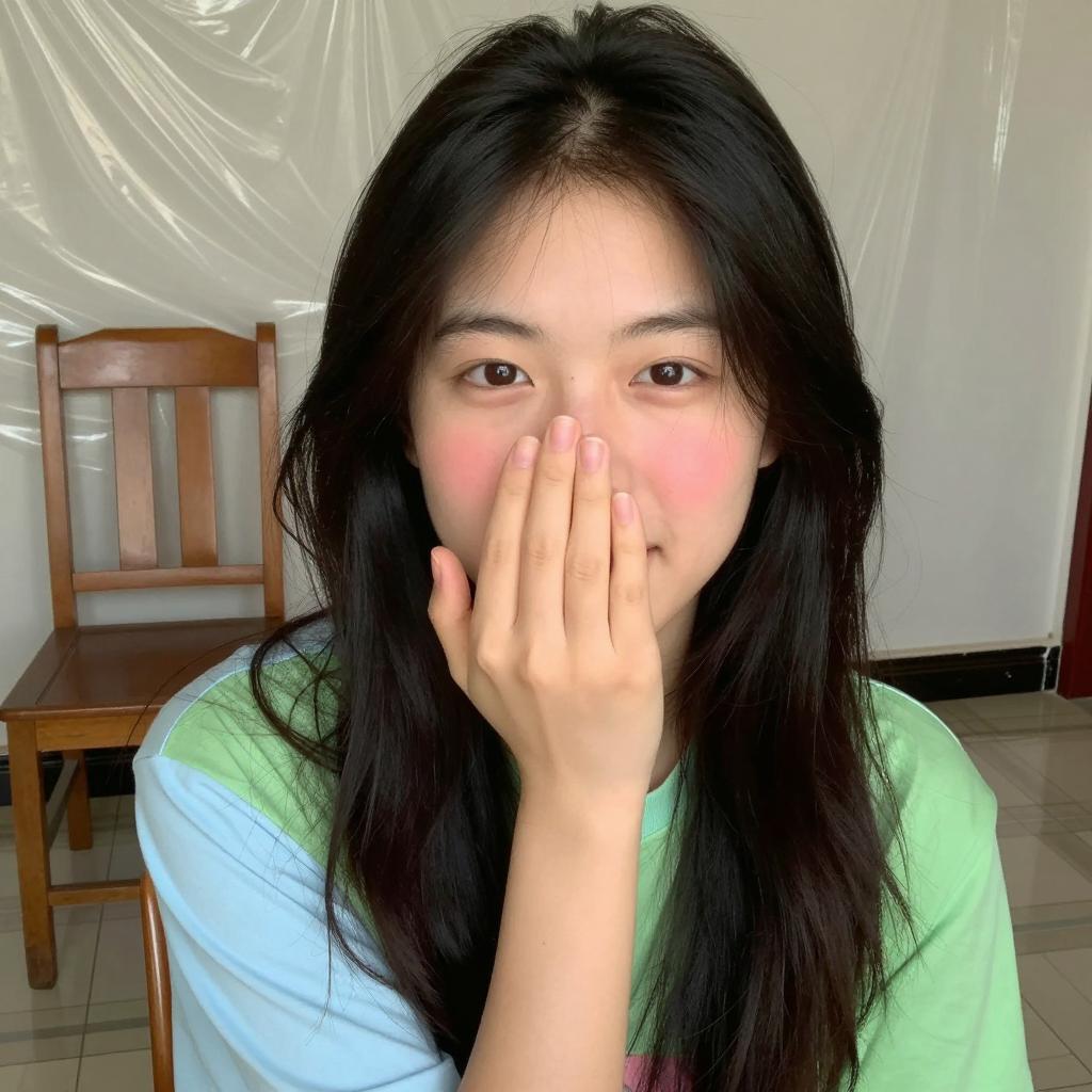 Woman with long black hair covering her mouth with her right hand, light pink blush on her cheeks. Background shows wooden chair and plastic-covered wall. She wears a green shirt with a light blue sleeve. Floor is tiled in a checkered pattern. Her expression is neutral. The image is a photograph.