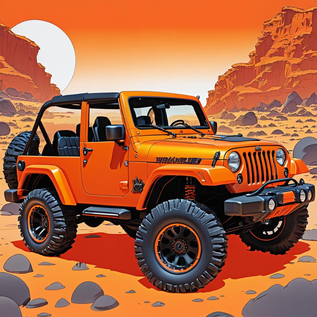 A rugged orange Jeep Wrangler, no people, styled by Mike Mignola, J. Scott Campbell, with vibrant colors and comic cover art influences.
