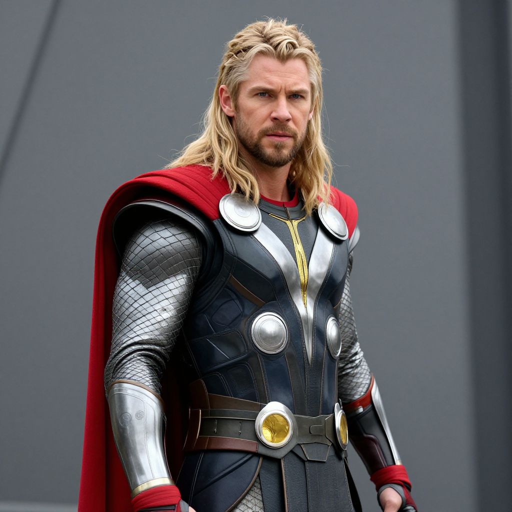 Avengers endgame thor, 1boy, male focus, solo, realistic, cape, blonde hair, armor, red cape, blue eyes, belt, looking at viewer