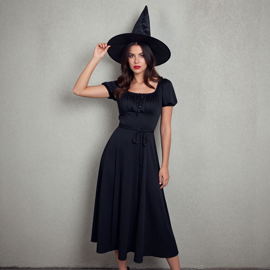 Witch Outfit Costume, woman in black dress and hat posing for a picture