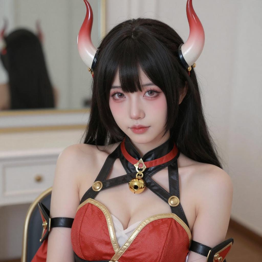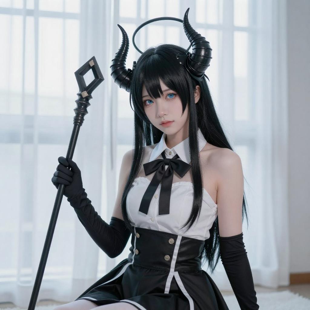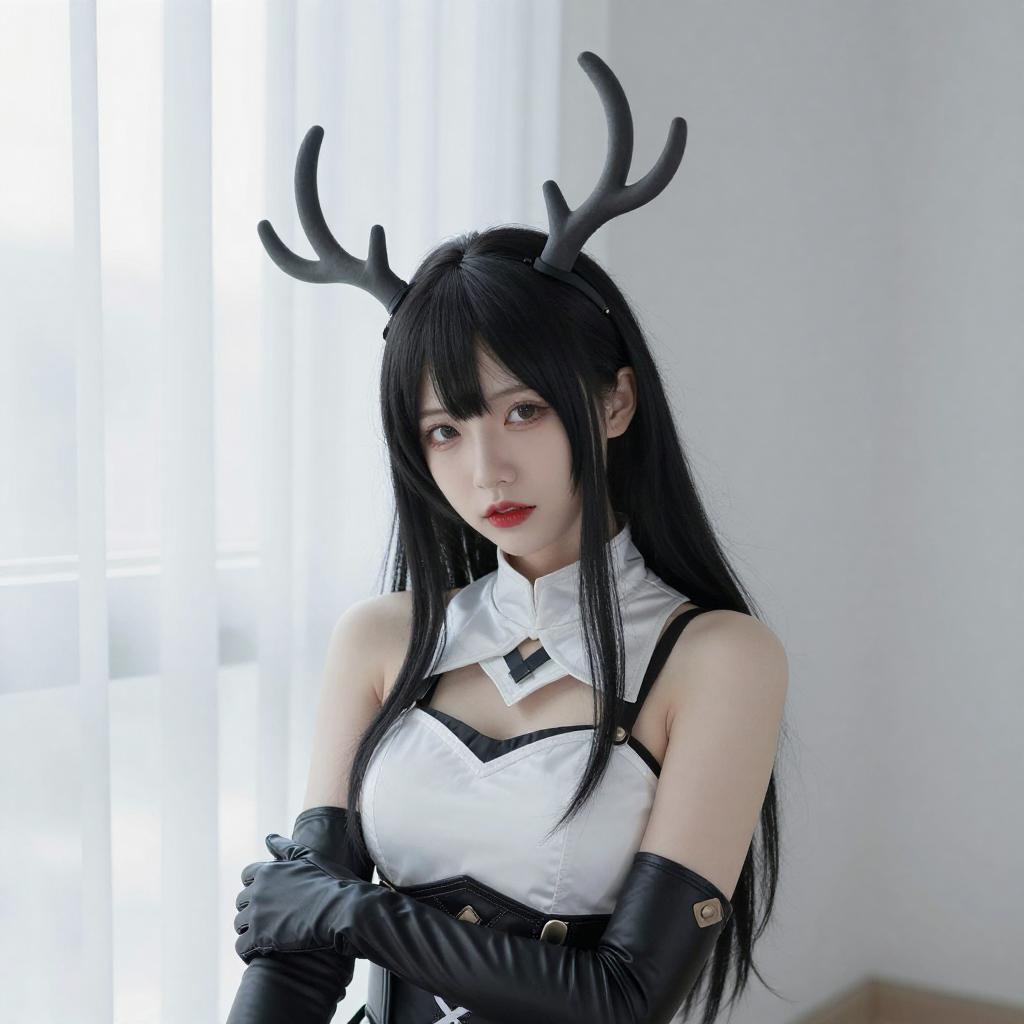 Photograph of a young woman with pale skin and long black hair, wearing a white and black cosplay outfit with black gloves and a black headpiece with antler-like shapes. She has red lipstick and sits near a window with white curtains, looking directly at the camera. The background is bright and minimalistic.