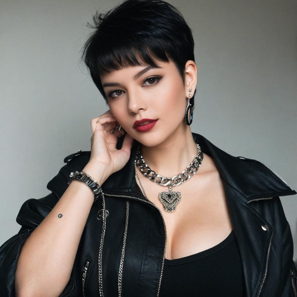 Portrait of a young woman with short black hair wearing a black leather jacket and black top. She has bold makeup with red lipstick and eyeshadow, multiple silver earrings, a silver chain necklace with a large heart pendant, and a matching bracelet. The woman also features several piercings including eyebrow and ear piercings. She poses with a slight head tilt and her hand near her face against a neutral background.