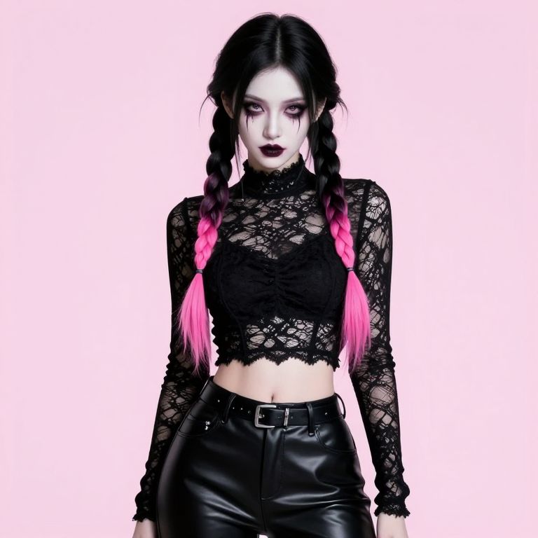 Gothic-style woman with white face, black lace crop top, long black leather pants, pink braided pigtails, dark lipstick, white