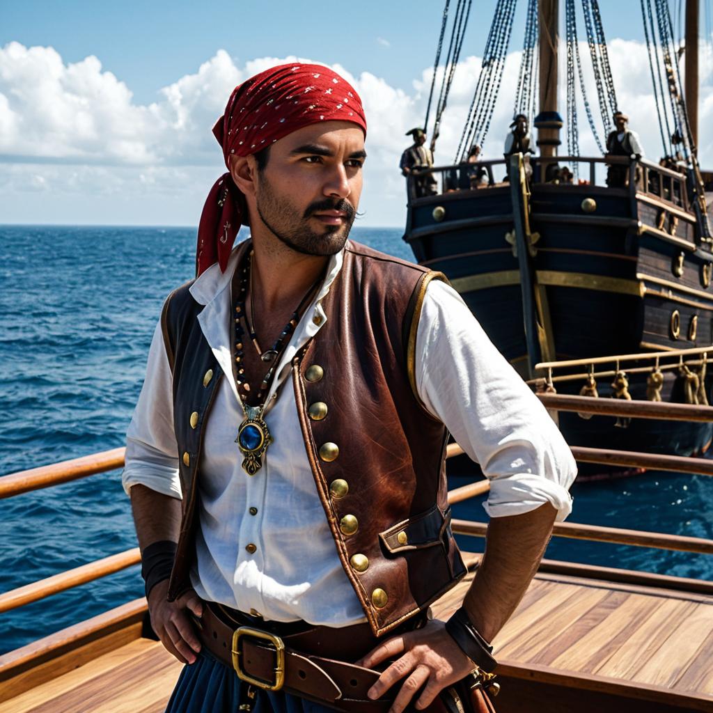 A man dressed as a pirate standing on a wooden dock or ship deck with a pirate ship in the background. He wears a red headscarf with white patterns, a brown leather vest with brass buttons over a white shirt with rolled-up sleeves, a dark blue undershirt, and a brown belt with a gold buckle. Accessories include a necklace with a blue gem pendant, various leather straps, and wristbands. The scene is set during daytime on the ocean with a cloudy sky, evoking a historical pirate adventure theme.