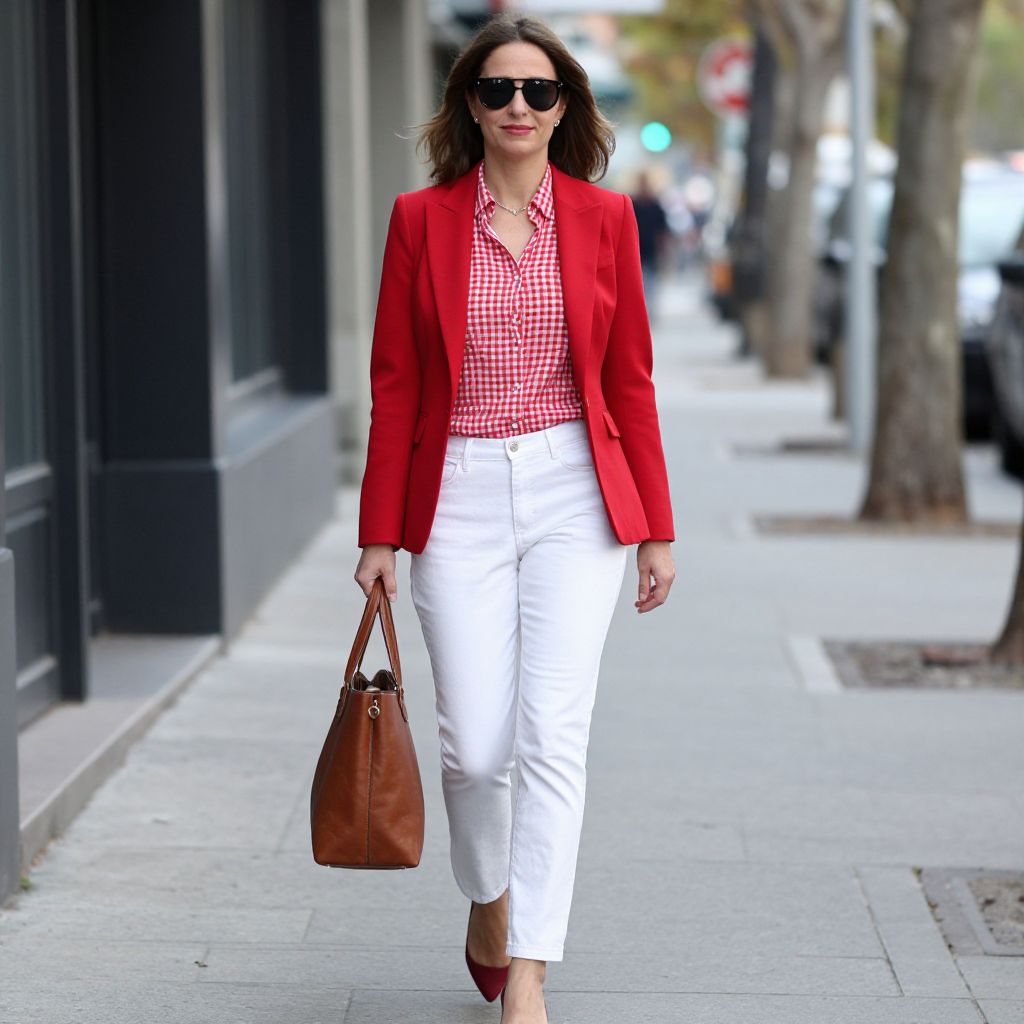 Woman walking confidently down a sidewalk wearing a vibrant red blazer over a red and white gingham shirt, paired with crisp white pants, while carrying a brown leather tote bag and smiling towards the camera.