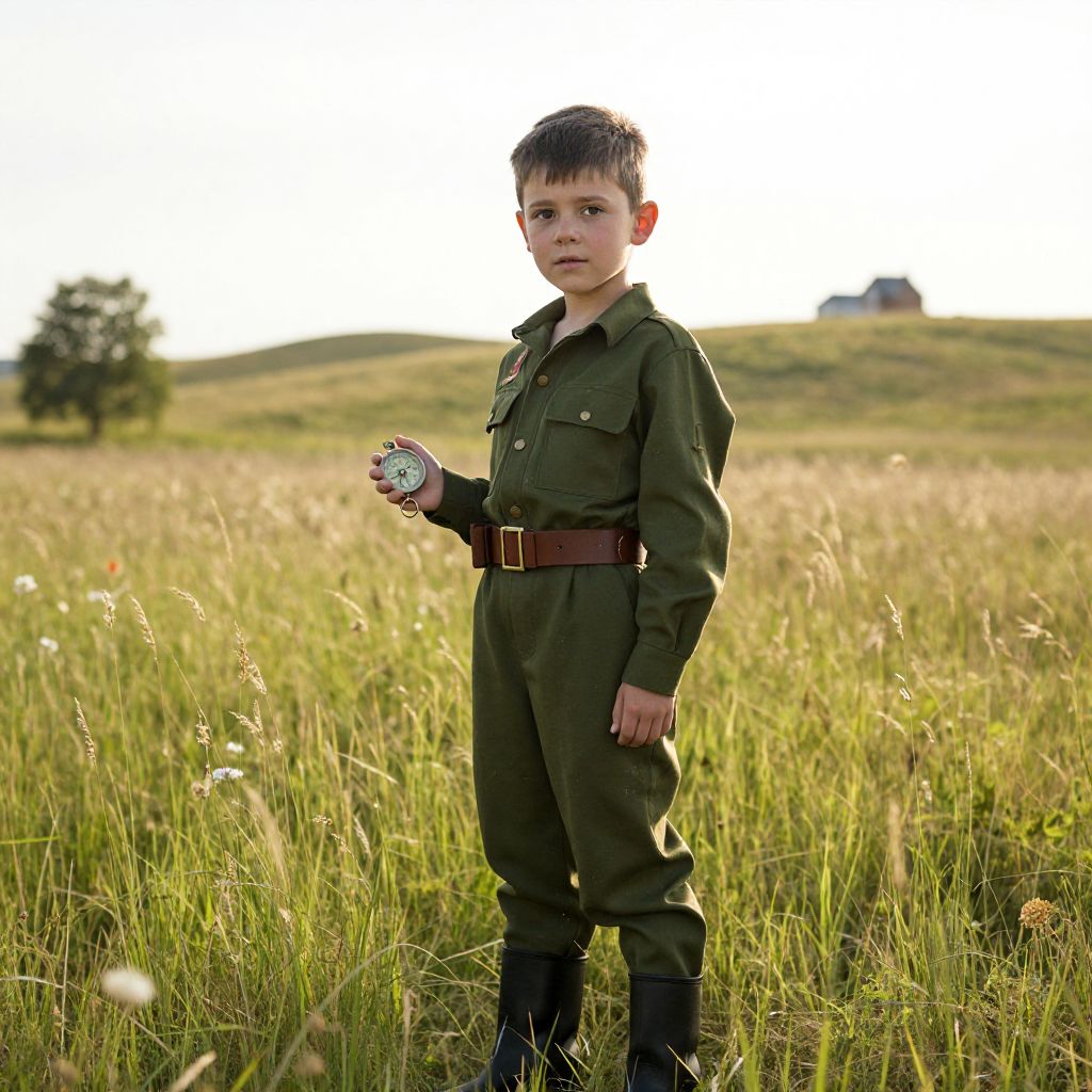 A young boy, around 8 years old, dressed in a slightly worn but well-kept green military uniform with sturdy black boots and a brown leather belt, stands confidently in a sunny meadow during early summer. His uniform bears faint scuffs and patches, suggesting years of service in training, yet remains neat and respectful. His dark brown eyes are bright with curiosity and quiet determination, reflecting the golden sunlight that spills over the field. He holds a small, weathered compass in one hand, pointing toward a distant hill. The warm, soft light casts gentle shadows and highlights the texture of his clothing, the grass, and the gentle breeze moving through the tall blades. The background features a gently rolling field with wildflowers, a few scattered trees, and a faint outline of a distant farmhouse. The scene is rendered in a realistic style with a subtle nostalgic charm, evoking memories of childhood adventures and simpler times.