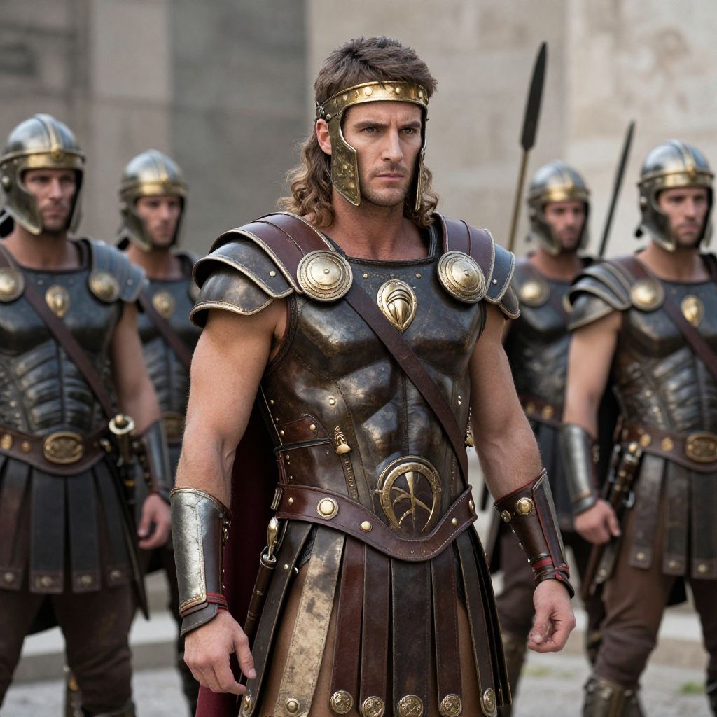 "Troy Achilles Cosplay, a man in a roman costume stands in front of a group of soldiers"