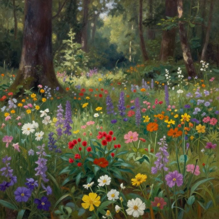 Wide-Angle Photography vintage colorful flowers in the forest,cinematic light, hyper realistic photo oilpainting,