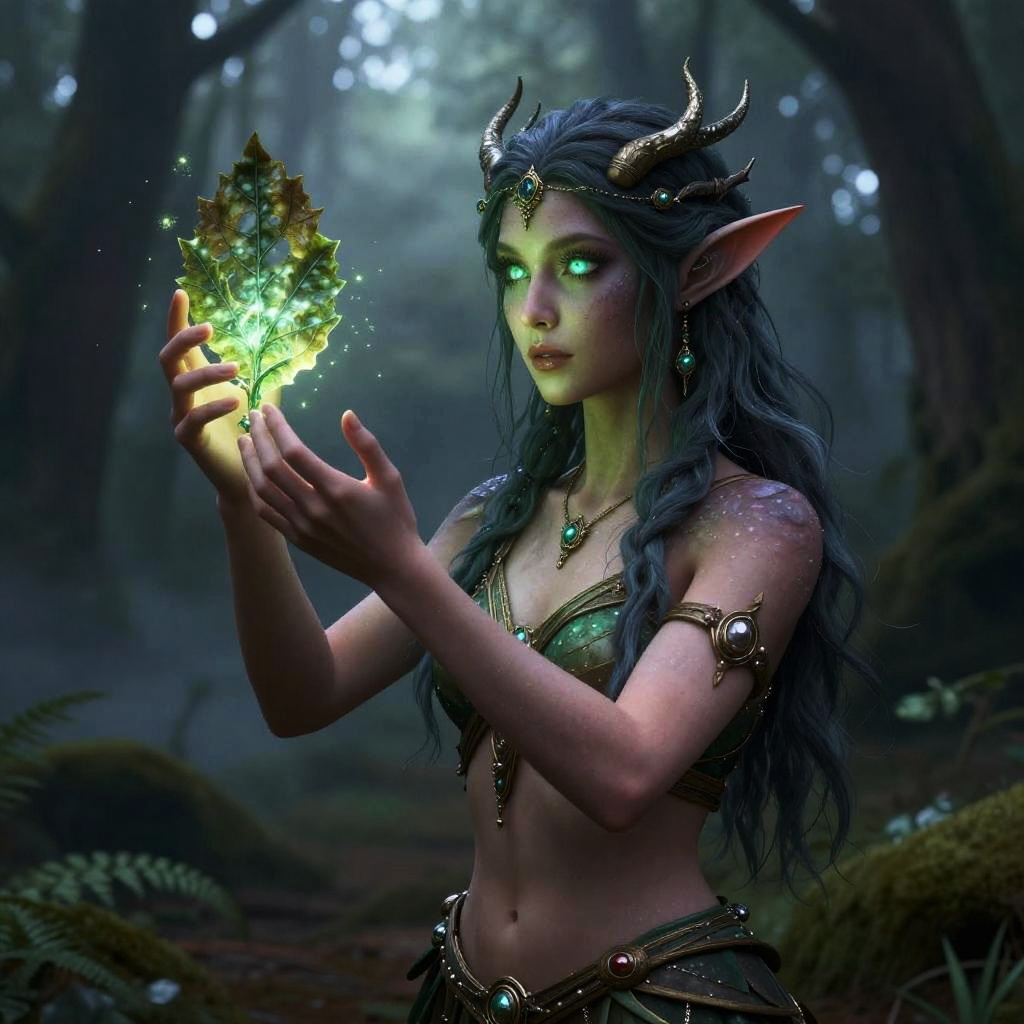 Realistic photo.a mystical forest spirit in emerald and silver, floating in space among fireflies and leaves. A cinematic, high-detail composition in a surreal art style. realistic photo
