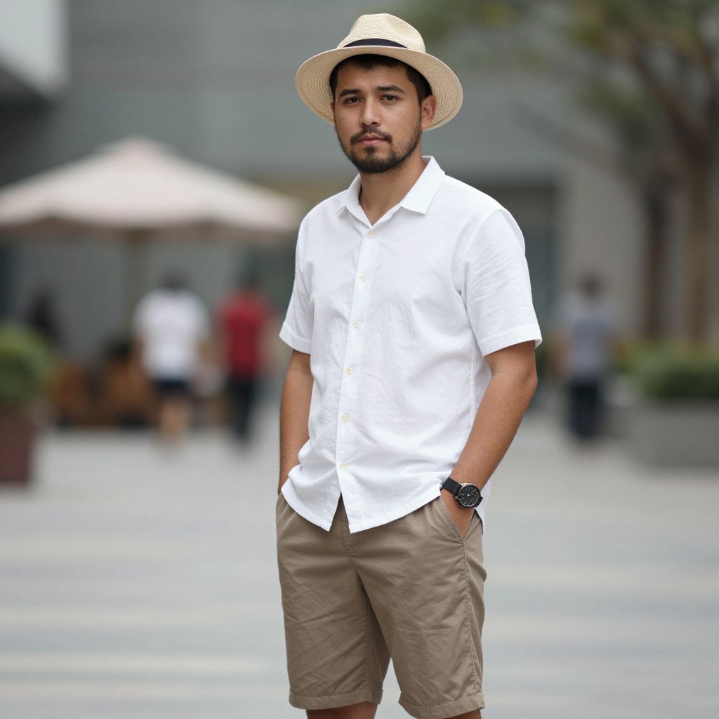Man casual summer outfit, 1boy, male focus, solo, hat, facial hair, shirt, shorts, watch, wristwatch, hand in pocket, beard, blurry background, white shirt, outdoors, blurry, brown shorts, collared shirt, looking at viewer, standing