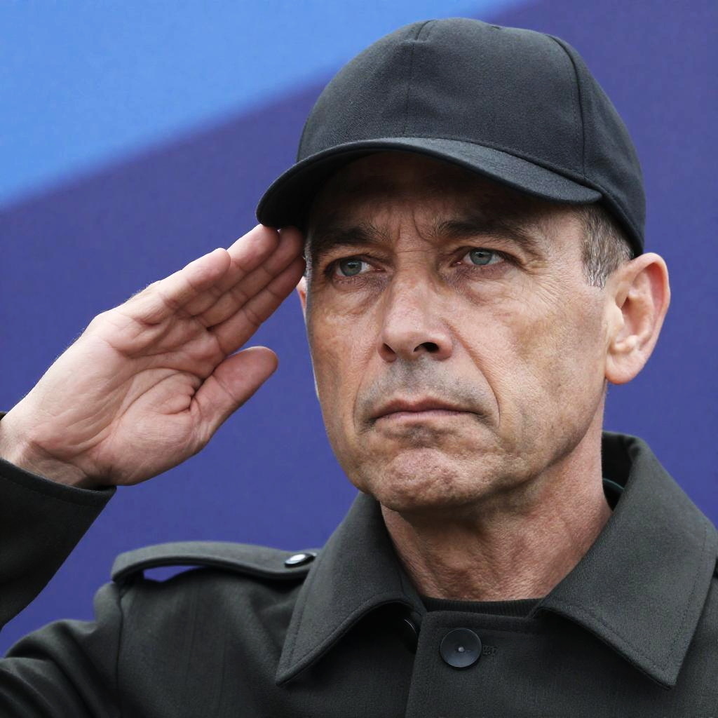 - Man in center: middle-aged, short-cropped gray hair, beard, green military jacket, gloves, focused expression, holding cup.