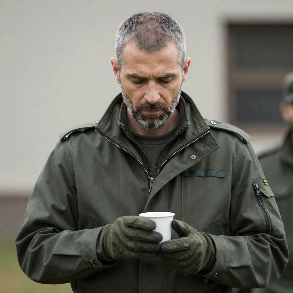 Focused middle-aged man with short-cropped gray hair and beard wearing a green military jacket and gloves, holding a white disposable cup with both hands outdoors.