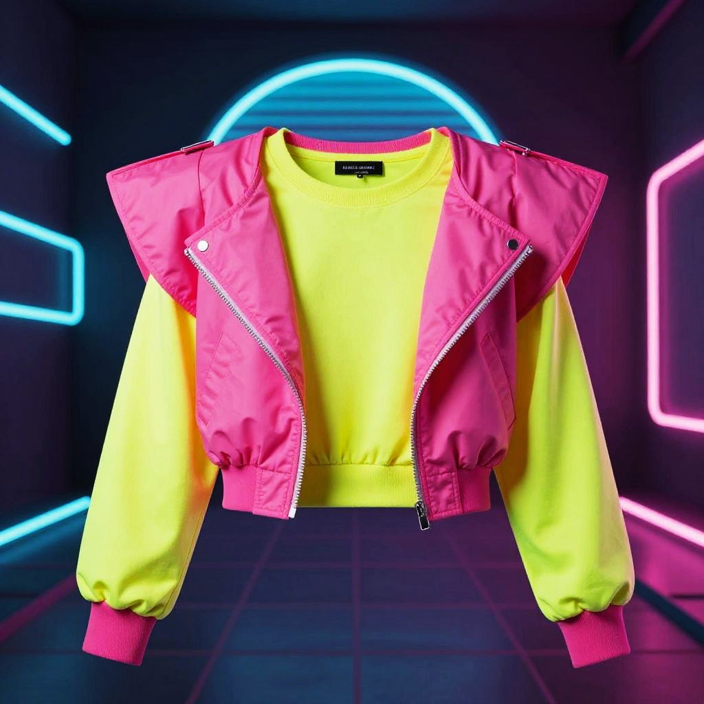 Big shoulder pads 80's fashion style, vibrant neon colors, retro futuristic background, sharp geometric patterns, dramatic lighting, high contrast, glossy textures