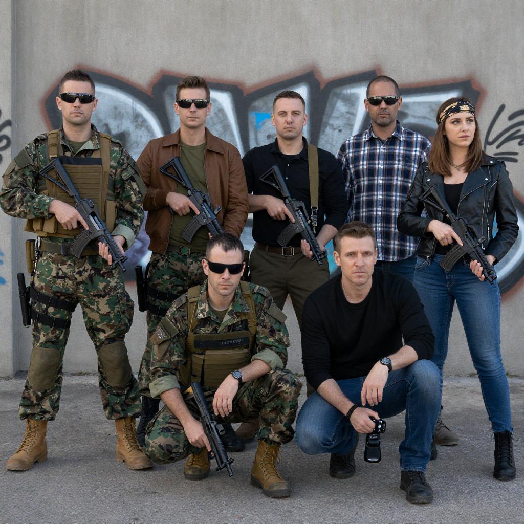 Group of six people in military and casual attire, standing and crouching in front of a graffiti-covered wall. Five men with guns, one woman with a headband. Three men in camouflage, one in a brown jacket, one in a plaid shirt, one crouching, holding a camera. Woman in a black jacket and blue jeans, looking to the side. Intense expressions, holding guns, graffiti background.