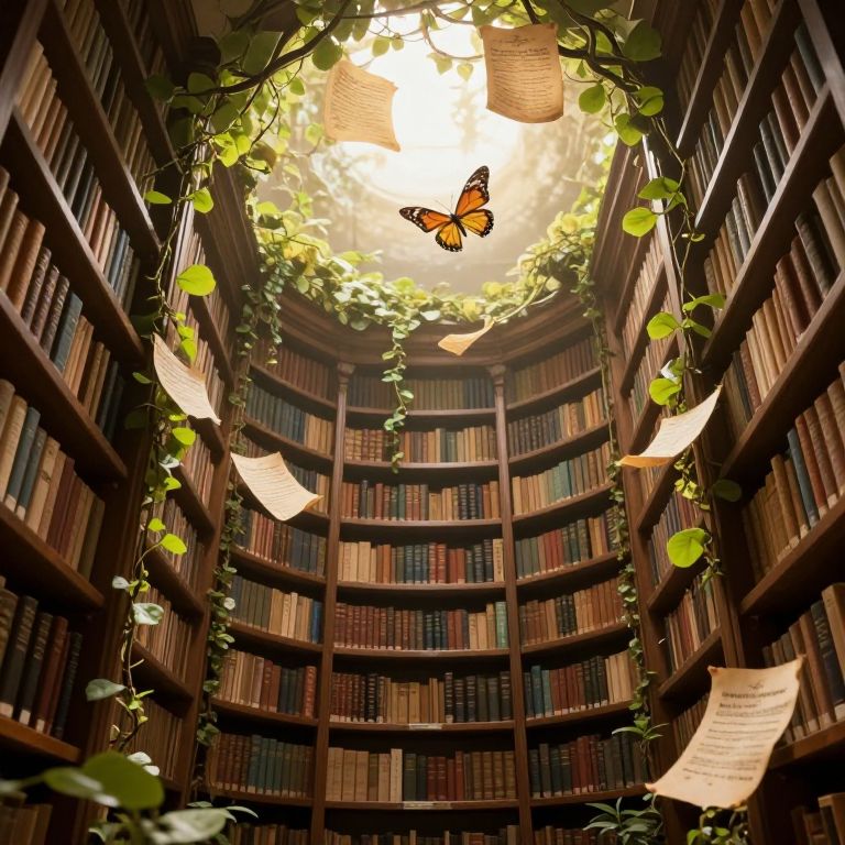 In a library where ancient wisdom whispers secrets to the heavens, parchment vines climb toward a luminous ceiling, while a butterfly flutters freely, symbolizing the boundless flight of imagination amidst the timeless embrace of knowledge.