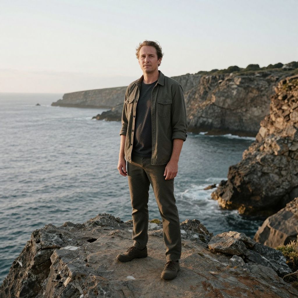 An artistic portrait of a man standing confidently on a rocky coastline with the ocean and cliffs as a backdrop, exuding a sense of adventure and tranquility.
