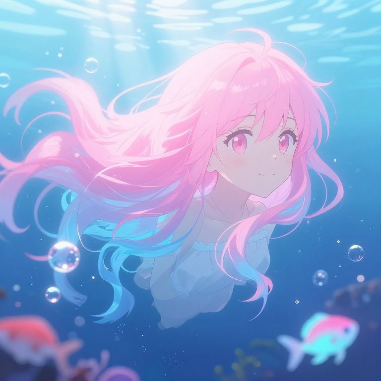 Anime long wavy hair colored with pastel pinks and blues, floating freely in a magical underwater scene with bubbles and glowing sea creatures, character's subtle smile and serene gaze, soft light filtering through water creating enchanting reflections.