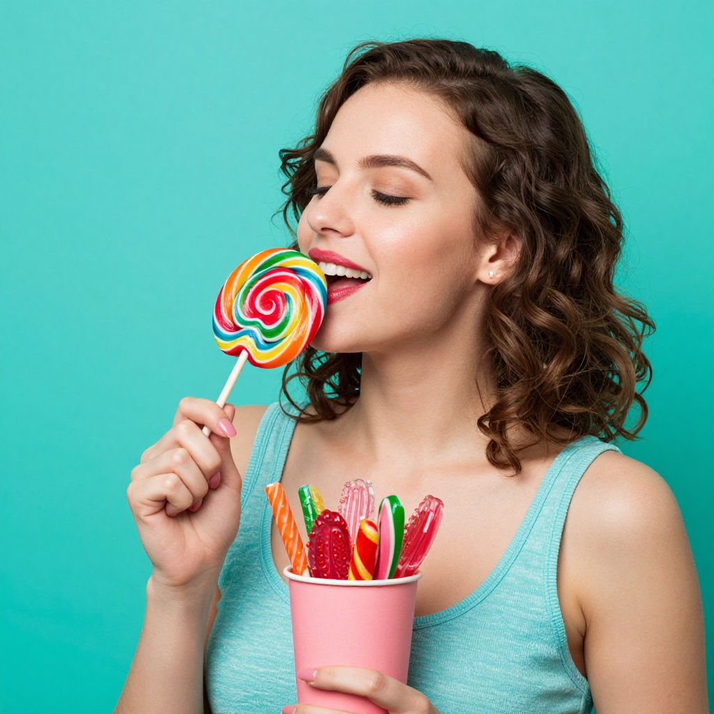 Photograph of a fair-skinned woman with curly brown hair against a turquoise background. She wears a light blue, polka-dotted, spaghetti-strap top and holds a pink cup filled with colorful lollipops. She is licking a large, rainbow-swirled lollipop with closed eyes, showing a content expression. The image is brightly lit, emphasizing the vivid colors of the lollipops and the simplicity of the background. The woman's makeup is subtle, with a slight touch of pink lipstick. The texture of her hair is soft and wavy.