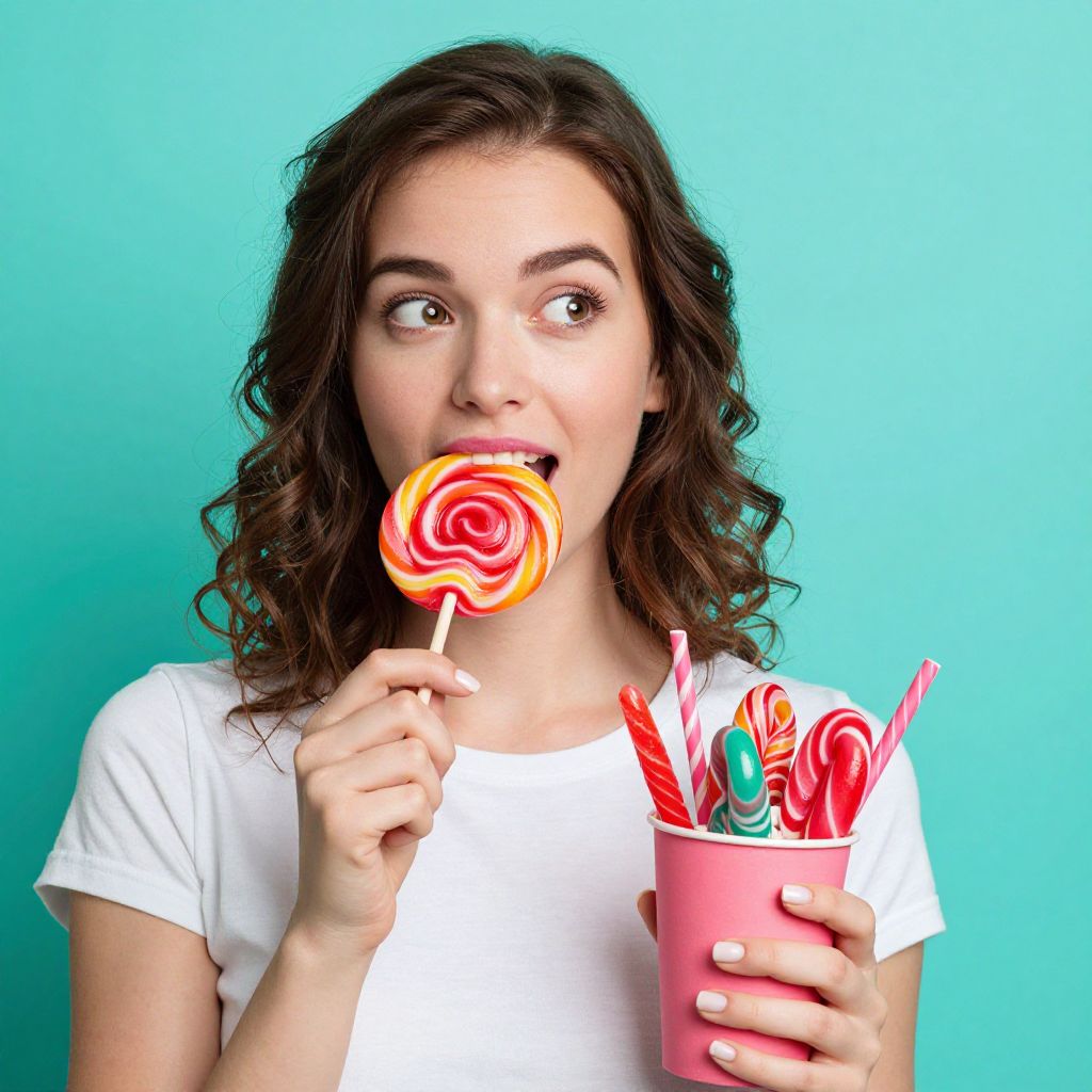 Photograph of a young woman with curly brown hair, blue polka-dot top, licking a colorful swirl lollipop, holding a pink cup with red