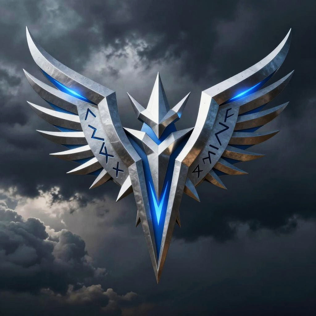 Valkyrie logo, Marvel-inspired, sleek metallic design with Nordic runes, dynamic wings spread, glowing blue accents, futuristic yet mythical style, set against dark stormy clouds background, high detail, epic fantasy vibe.