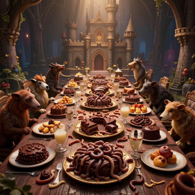 Houdini 3D Render A huge castle table filled ugly food made of animals huge chocolate cakes made of worms in a mystical farytale style, godrays,