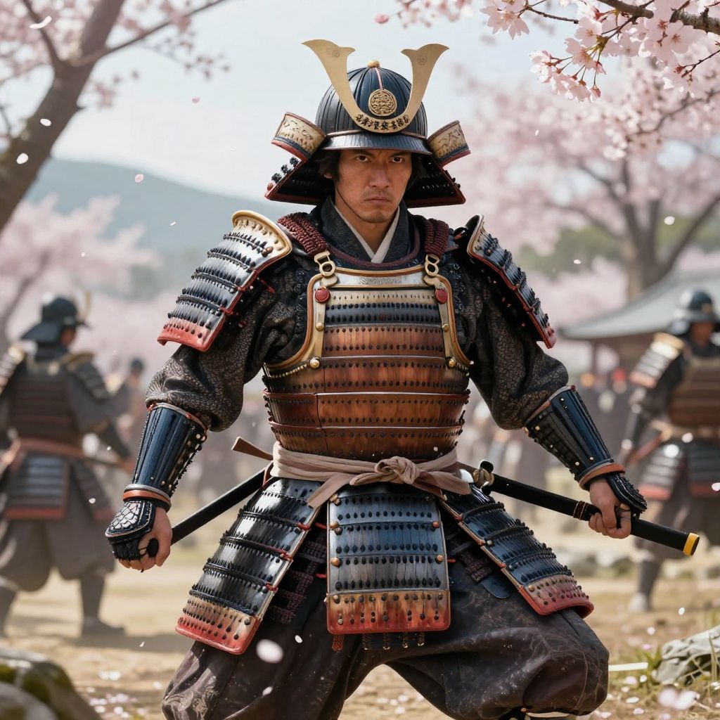 Bald samurai standing in ancient Japanese battlefield at sunset, traditional armor glistening, intense gaze, cherry blossoms falling around, dramatic cinematic lighting