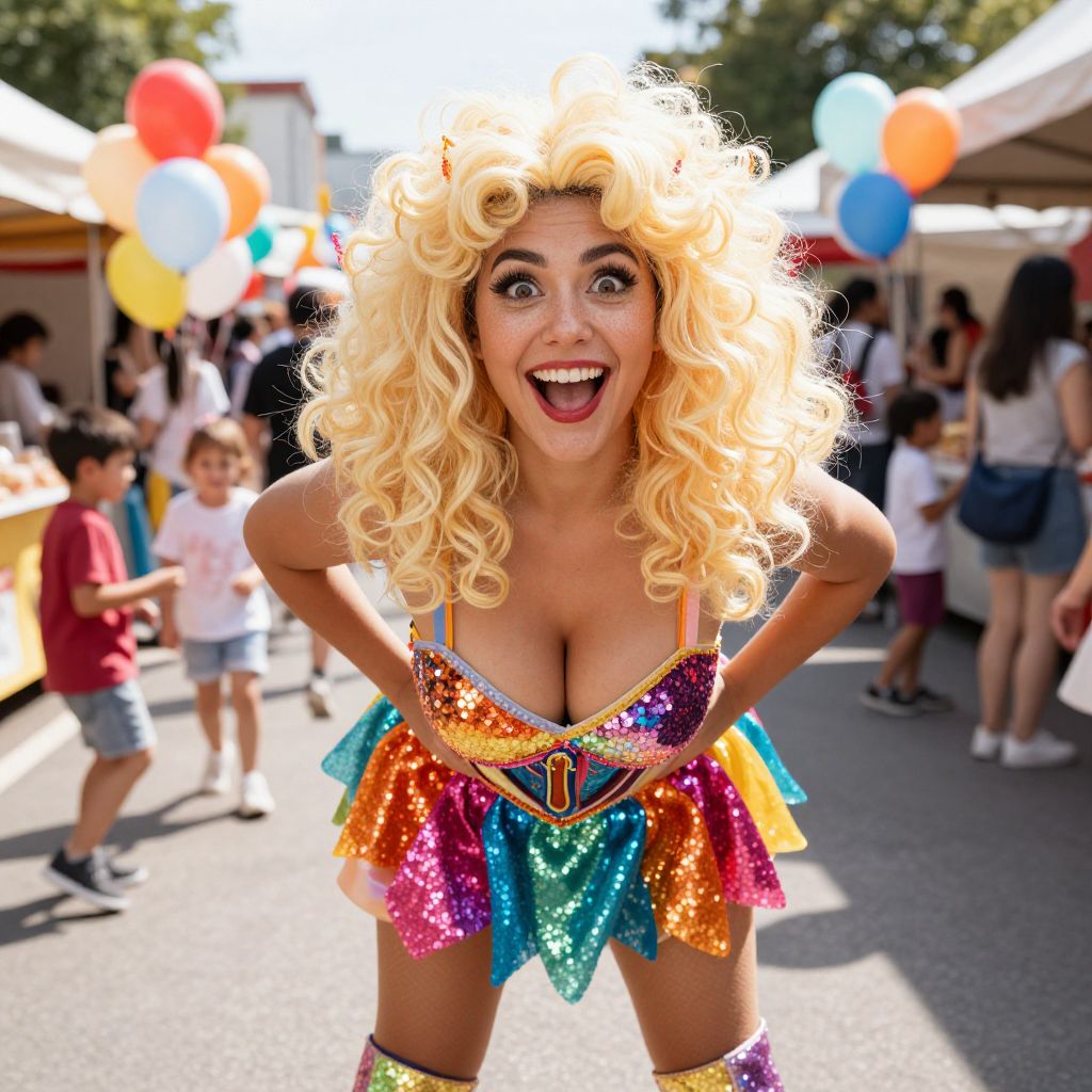 A joyful and energetic woman in a colorful carnival costume with a long, curly blonde wig, standing at a lively street fair in a sunny afternoon, surrounded by laughing children and colorful balloons, her face is bright and cheery with freckles, large bright eyes, and a playful expression, wearing a sequined dress and glittery boots. The woman has big tits and cute face