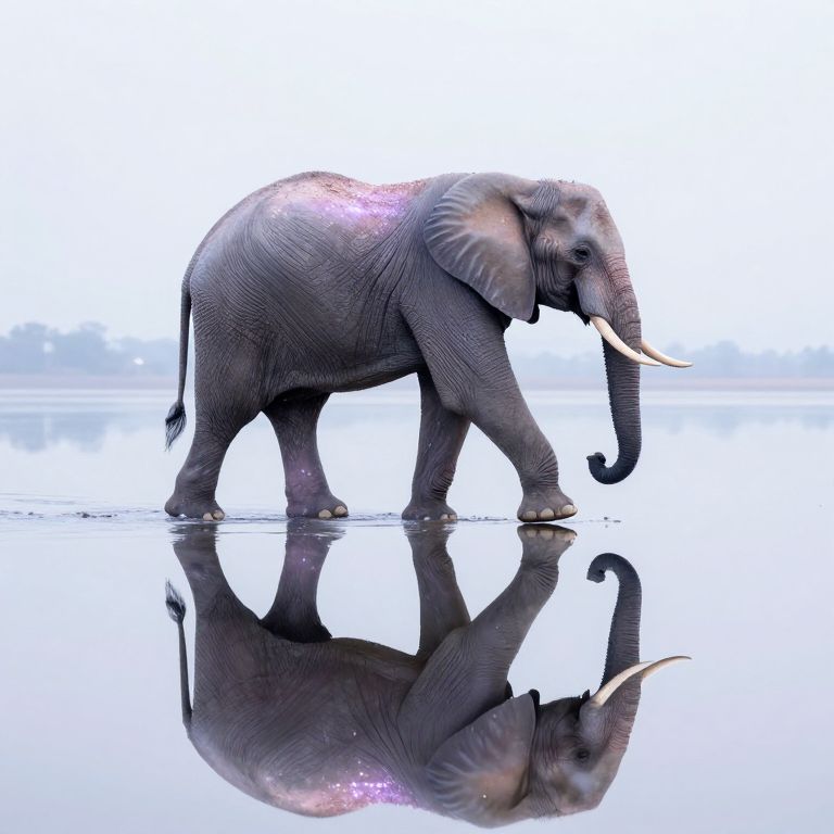 A serene, ethereal elephant strides gracefully across a shimmering, mirror-like expanse, its reflection perfectly mirroring the surreal tranquility of a dreamlike landscape.