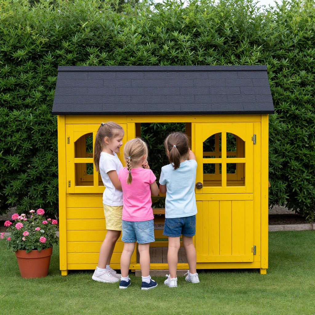 Photograph of a wooden doghouse with green trim, arched door, small window, shingled roof, and dark background. Wood grain visible