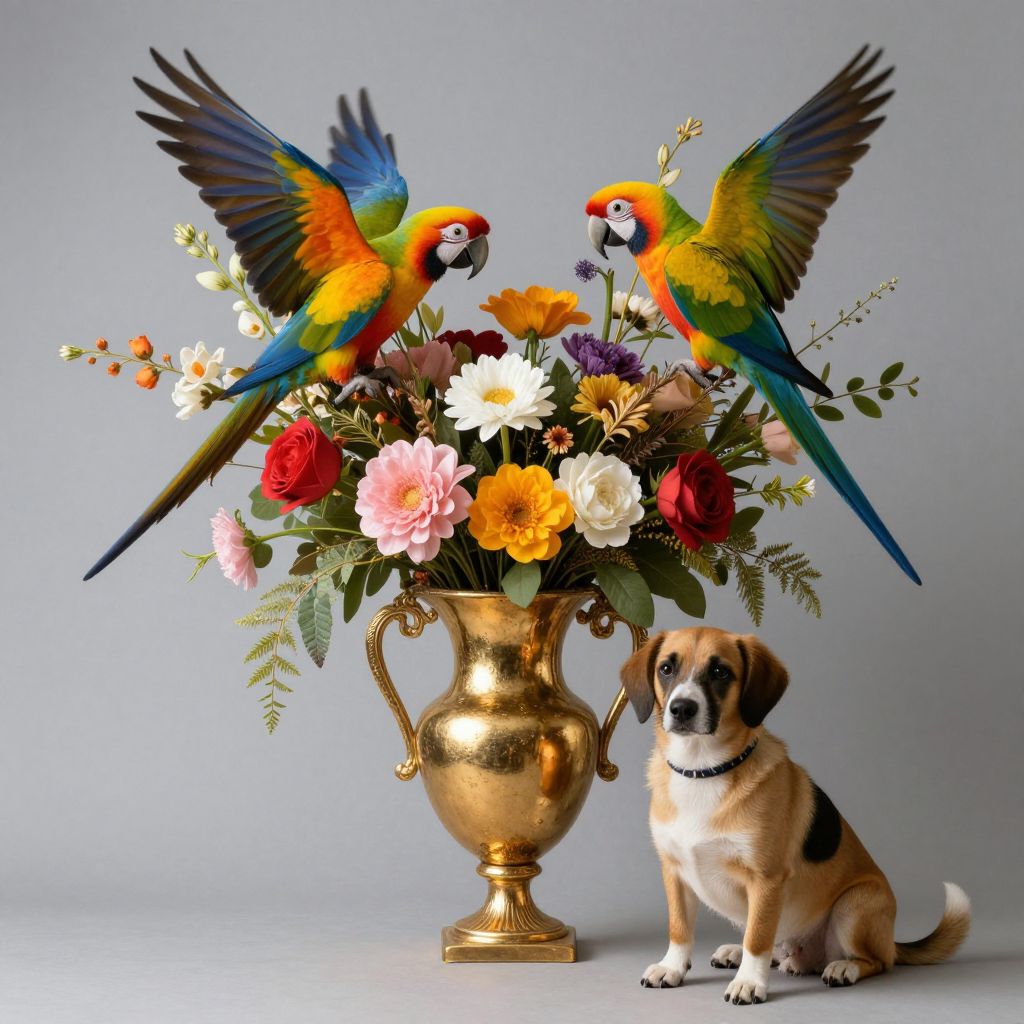 An exquisite still life brimming with serenity and vitality, where vibrant blooms and colorful parrots symbolize the fleeting beauty of life, while the loyal lapdog embodies steadfast companionship, all set against the timeless elegance of a golden vase, evoking a harmonious blend of nature’s splendor and enduring bonds.