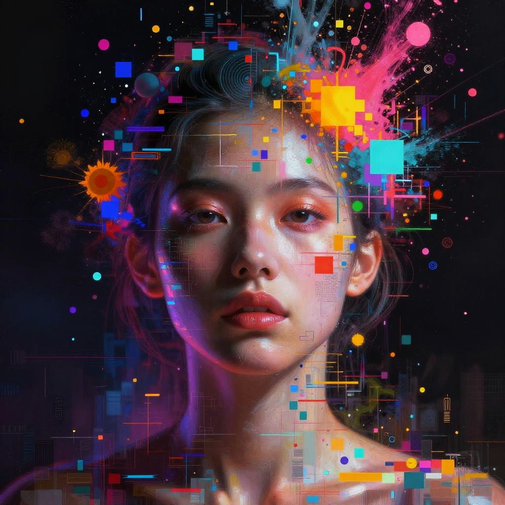 AI art, dynamic and colorful explosion of pixels and digital particles forming a surreal portrait blending human and machine elements, neon hues, glitch art aesthetics, mixed media style with fine brush strokes and digital effects, representing the fusion of technology and imagination