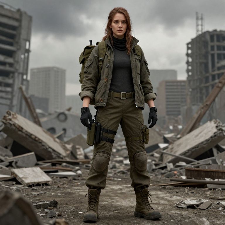 Amy apocalypse outfit, rugged and practical ensemble combining military and scavenger aesthetics, heavy boots, torn jacket, multiple backpacks and gear strapped, background of destroyed cityscape, muted color palette, dramatic overcast lighting, cinematic composition