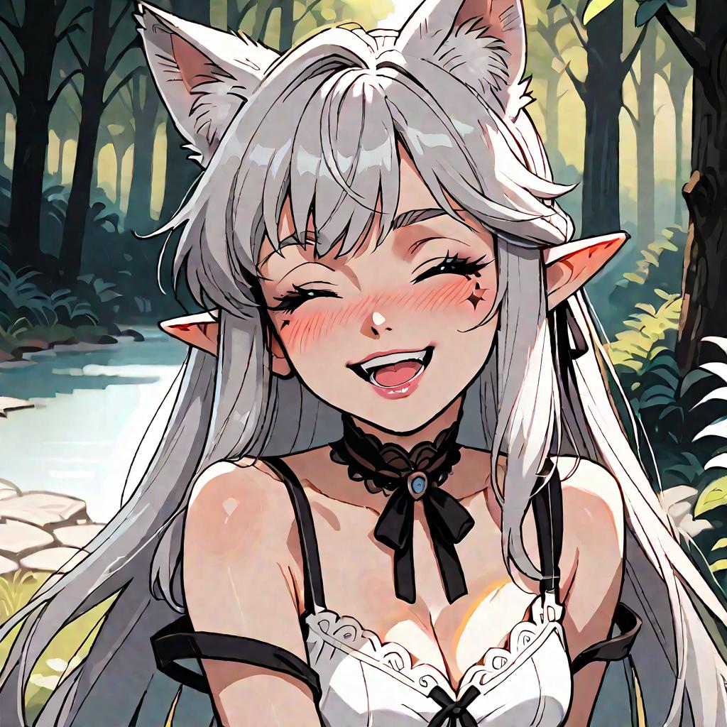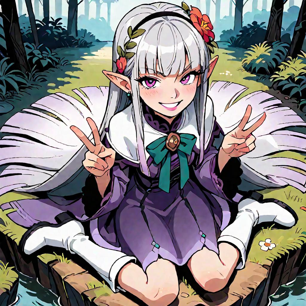 Score_9, score_8_up, 1girl, long hair, grey hair, hair flower, bangs, pointy ears, hairband, solo, blunt bangs, white capelet, long sleeves, looking at viewer, purple dress, very long hair, sitting, white footwear, knee boots, green bow, from above, grin, purple eyes, double v, smug, outdoors, forest, anime screencap, anime coloring, source_anime
