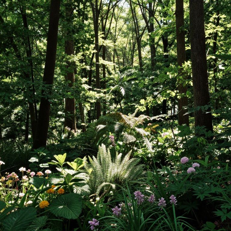 A peaceful forest scene with diverse plants, blooming flowers, and towering trees, sunlight streaming through the canopy creating dappled shadows on the forest floor