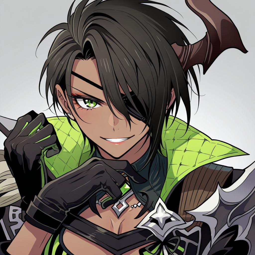 Aragami oga, holostars, 1boy, dark-skinned male, single horn, sharp teeth, green eyes, hair between eyes, hair over one eye, eyepatch, black hair, short hair, black gloves, virtual youtuber, virtual youtuber, by artist meremero, illustrious
