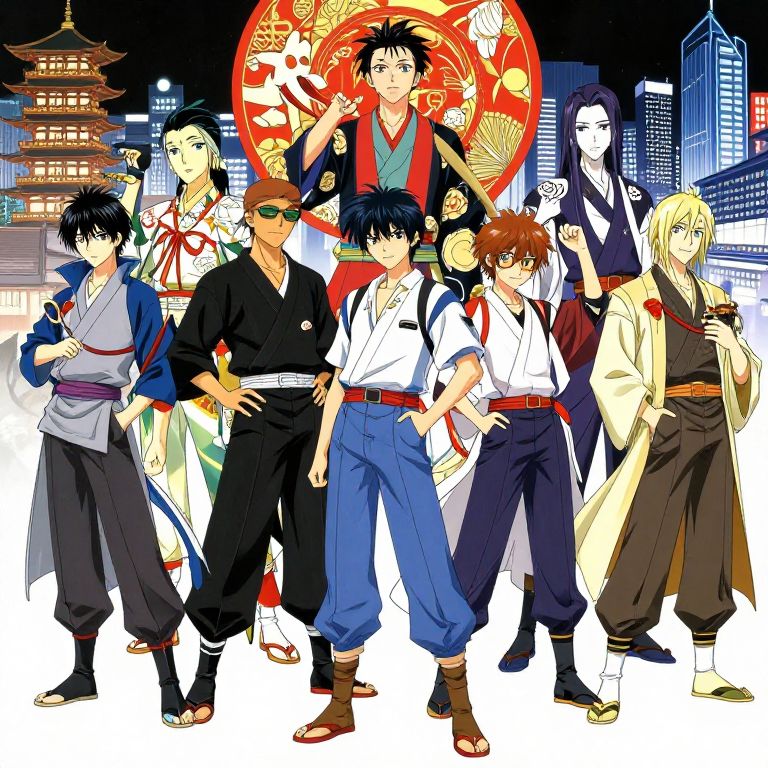 Dynamic group scene inspired by anime booru platforms with characters posing in various iconic outfits, elaborate backgrounds combining traditional Japanese aesthetics and modern cityscapes, high contrast lighting, vibrant colors, meticulous line work, animation frame style.