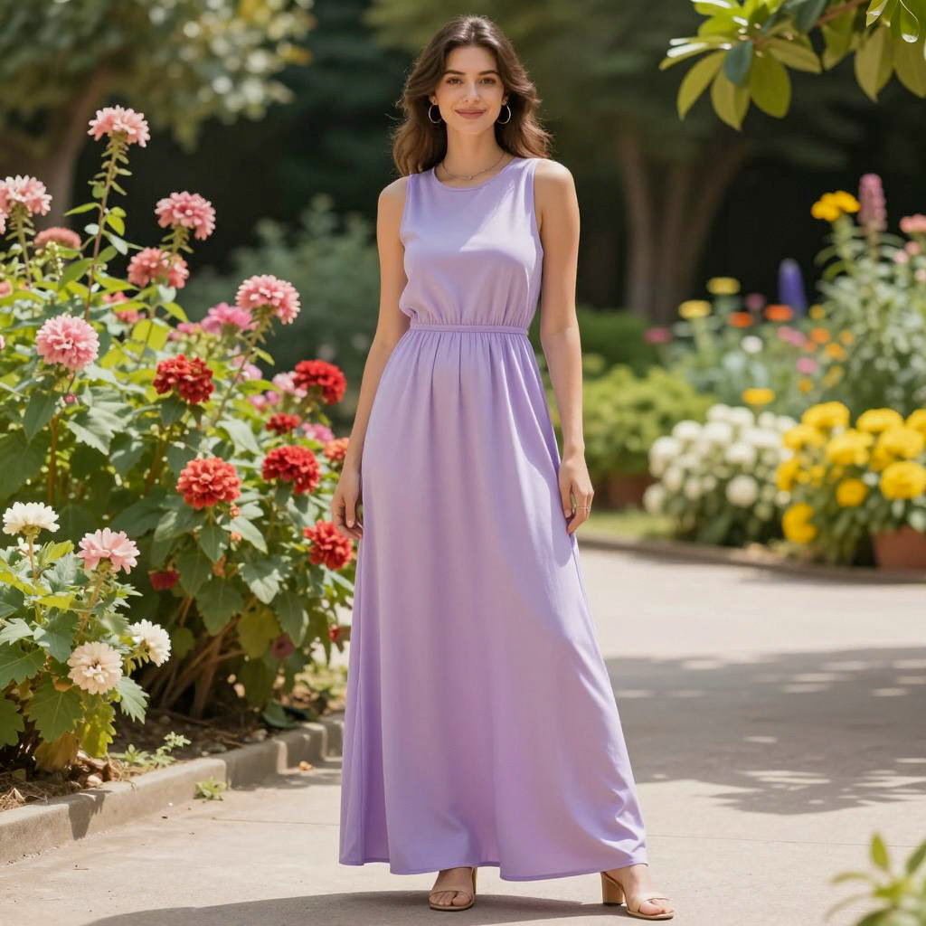 Maxi dress trendy, photograph of a young woman with long brown hair, wearing a sleeveless light purple maxi dress, standing in a sunny garden, surrounded by colorful flowers (pink, red, yellow), green foliage, concrete path, summer, natural light, smiling, casual, relaxed, full body, slightly blurred background, bright colors, soft shadows