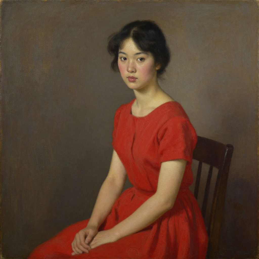 Classical oil painting of an Asian woman with fair skin, black hair, and red dress, seated on a wooden chair against a dark brown background,