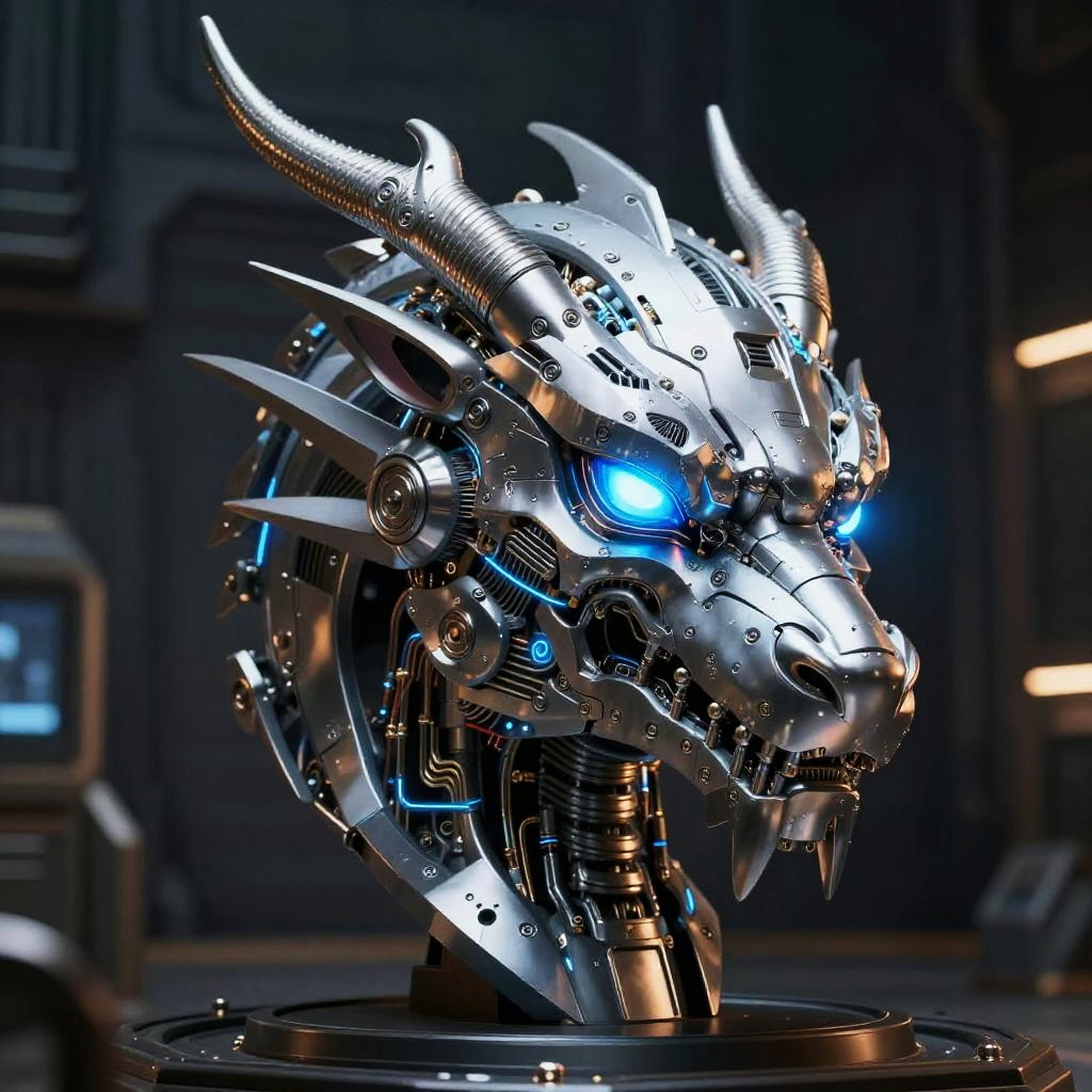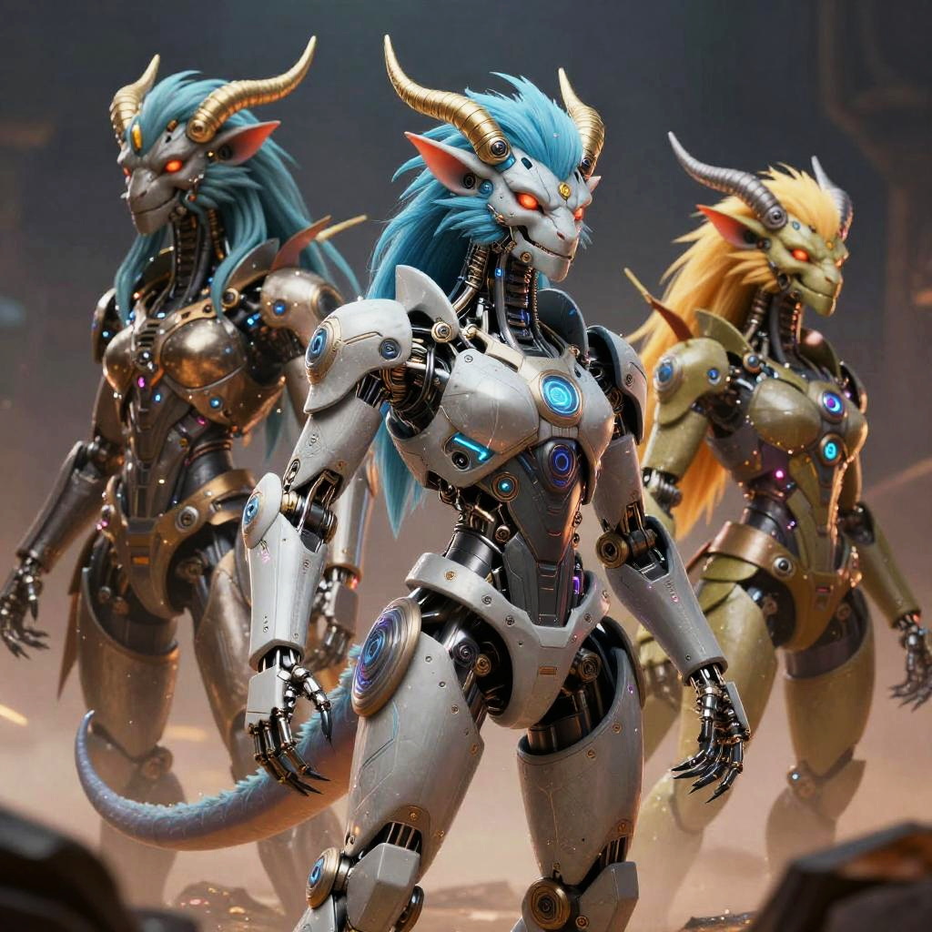 Ai fanart generator producing hyper-detailed portraits of mythical creatures fused with cybernetic enhancements, vibrant color palettes with glowing accents and dynamic composition, blending traditional fantasy themes and sci-fi aesthetics