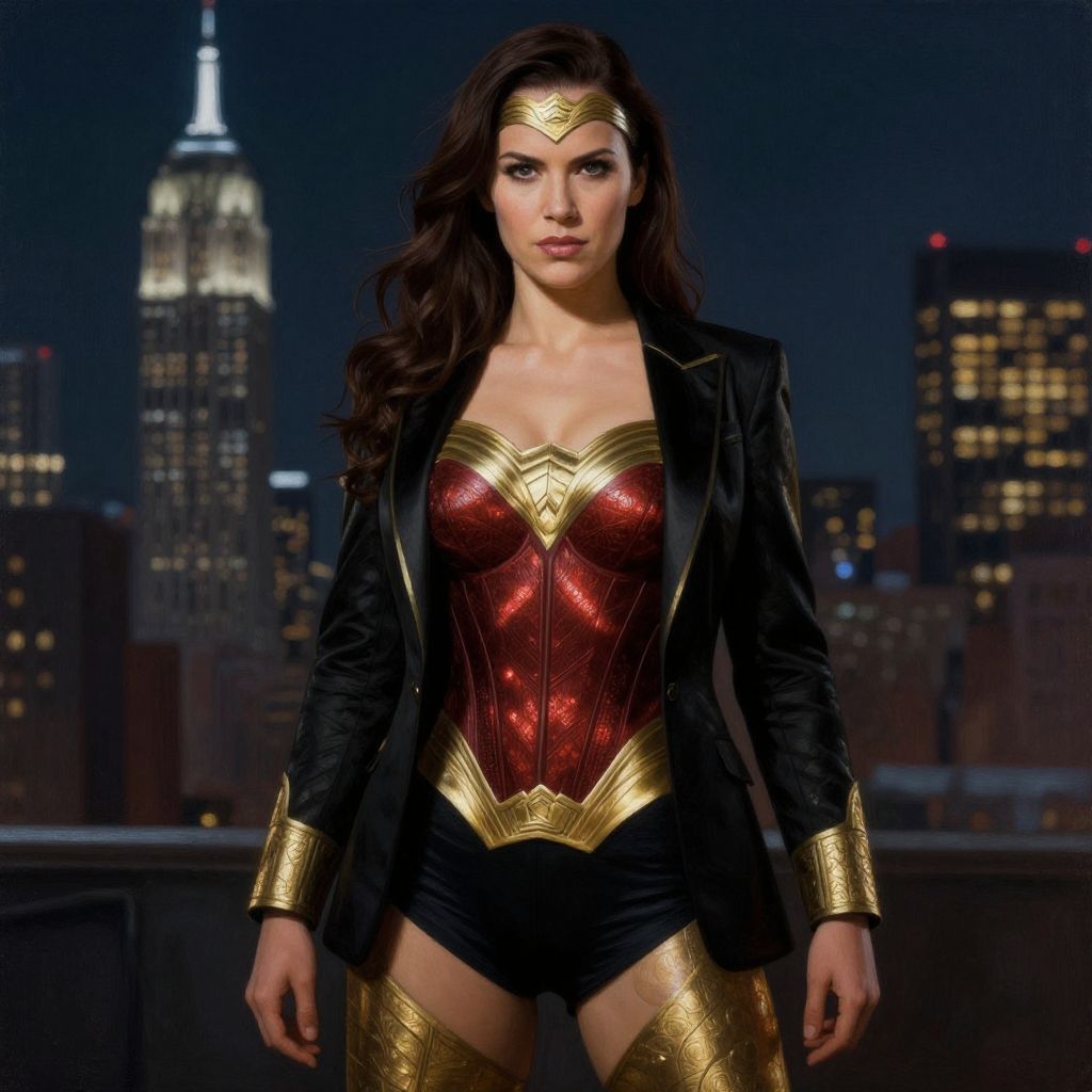 Photograph of Wonder Woman with long dark hair, red and gold corset, black jacket, gold tiara, standing against a nighttime city skyline with