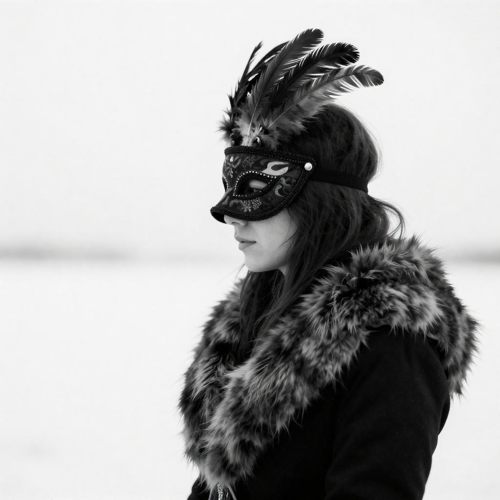 Black-and-white photograph of a person in profile, wearing a ured, furry collar and a dark, patterned mask with feathers. The background is a bright, overexposed white, creating a stark contrast. The person's head is slightly tilted downward, and their hair is partially obscured by the mask. The image has a surreal, abstract quality.