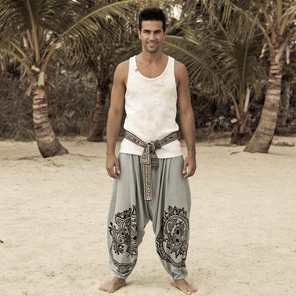 Photograph of a middle-aged man standing on a sandy beach with palm trees in the background. He has short, dark hair and a slight smile. He wears a white, sleeveless tank top and loose, gray pants with black, intricate floral patterns on the lower legs. A black and white patterned belt is tied around his waist. The man is barefoot, standing with his hands by his sides. The background features lush green palm trees and a sandy, sunlit beach. The image has a slightly desaturated, vintage filter.