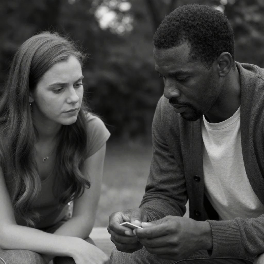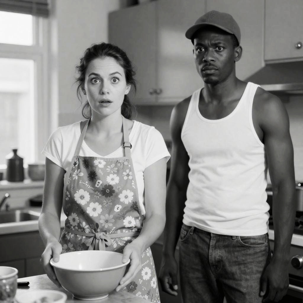 Black-and-white photograph of a woman in a floral apron and man in a tank top and hat standing in a cluttered kitchen. Woman holds a bowl, man stands to the right. Woman has surprised expression, man looks intense. Background includes cabinet, window, and kitchen items.