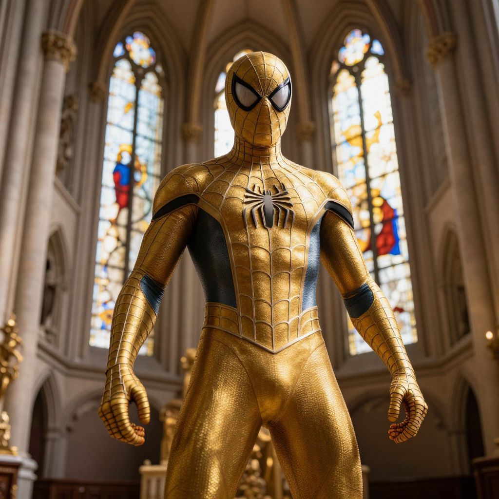 Photorealistic CGI of Spider-Man in a gold, textured suit, standing in a grand cathedral with tall, colorful stained glass windows.