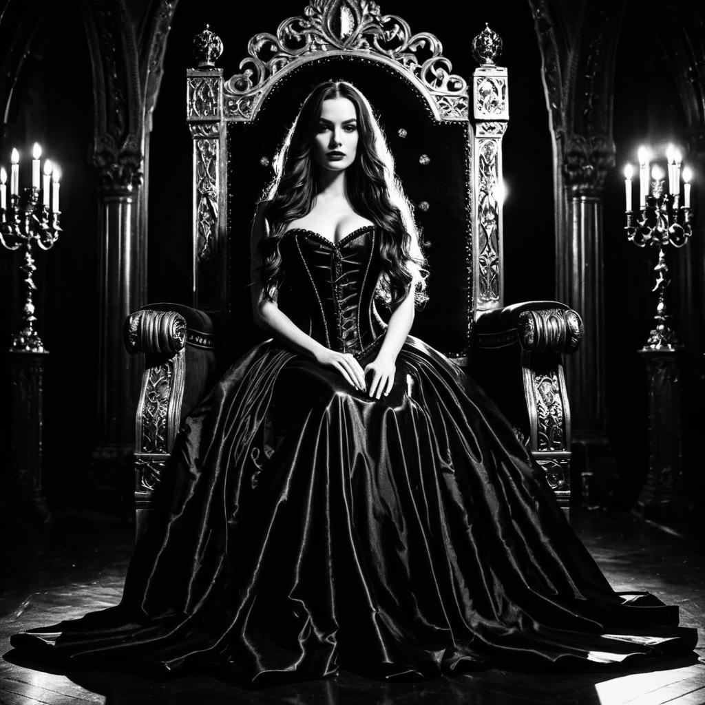 A mysterious woman with long flowing hair sitting on an ornate, dark throne, wearing a tight corset and a shiny, elegant gown with a slit, dramatic high contrast lighting emphasizing the glossy textures and shadows, dark moody gothic atmosphere, vintage glamor style, grayscale monochrome