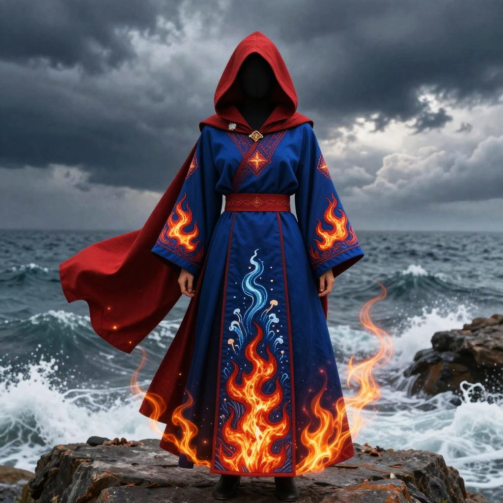 Fantasy mage outfit inspired by elemental magic, combining fiery red and deep blue hues, elegant embroidered flames and water patterns, arcane symbols glowing softly on the sleeves, a hooded cloak billowing with magical sparks, standing on a rocky cliff overlooking a stormy sea.