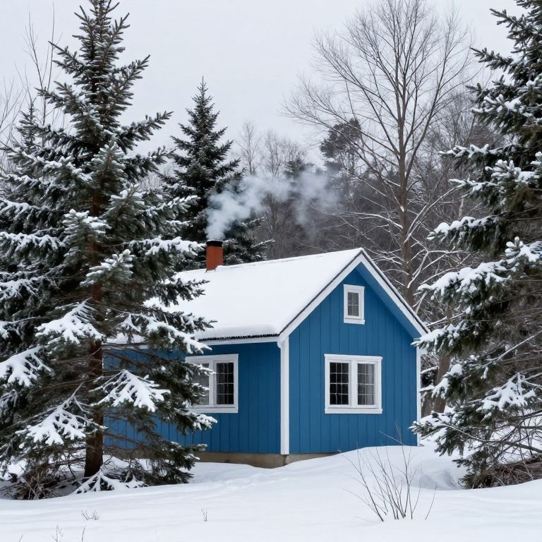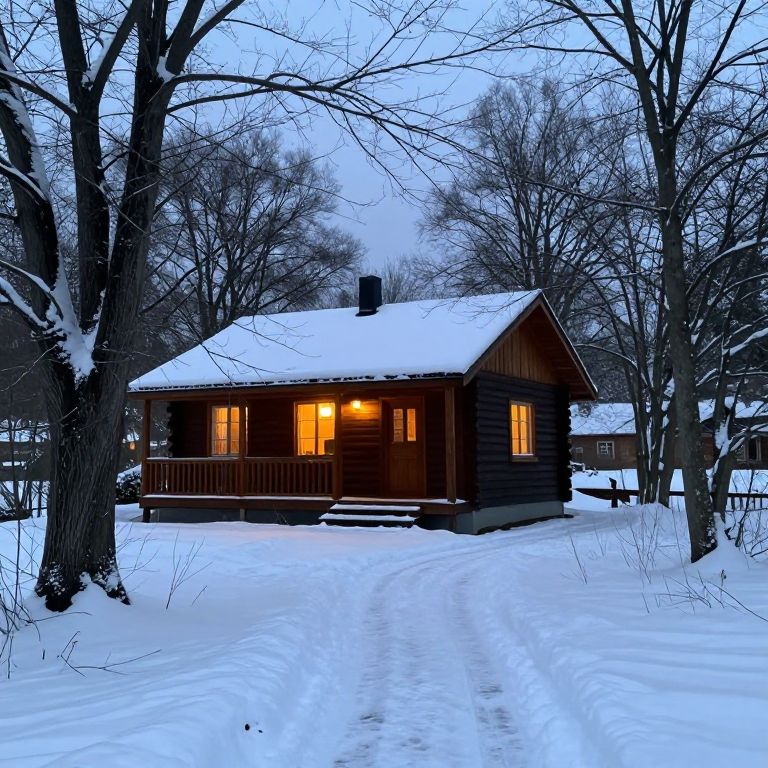 Snow-covered landscape embraces a cozy wooden cabin with warm, glowing windows, nestled amidst leafless trees and a winding snow-laden path leading up to its inviting porch.