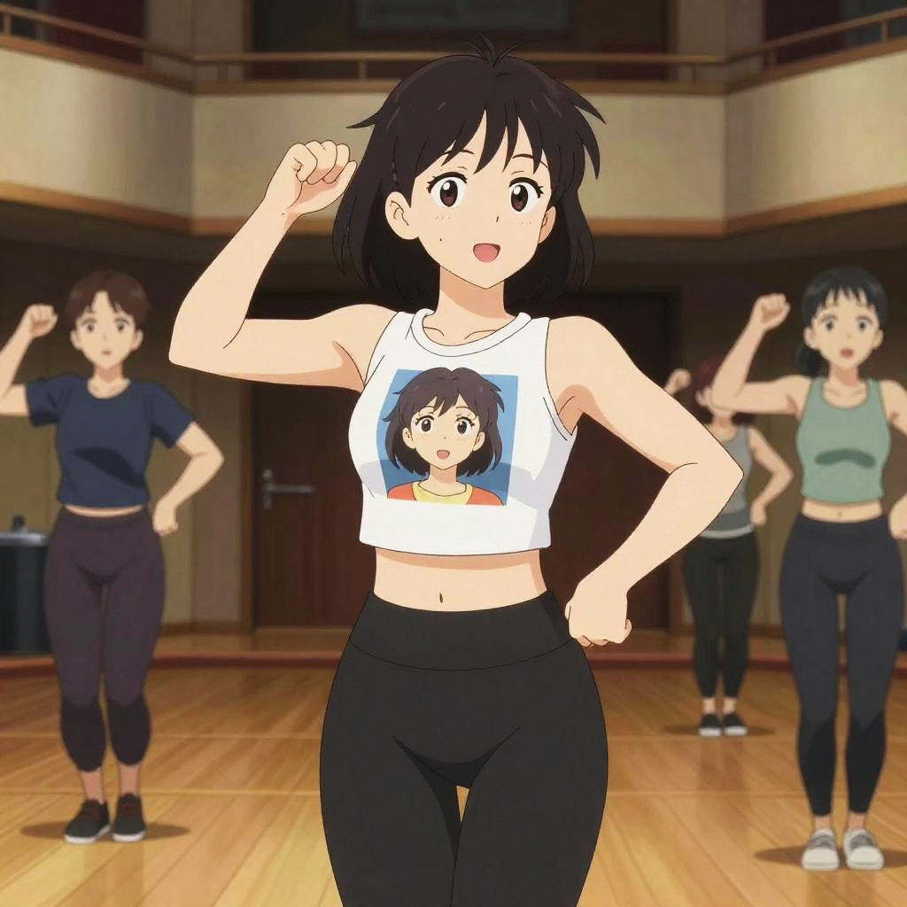 A woman, in a Kyoto Animation style, wearing a fitted crop top with animated character prints and high-waisted black leggings, enjoying an evening dancing class in a theater lobby. Sexy. Pretty face and beutiful eyes